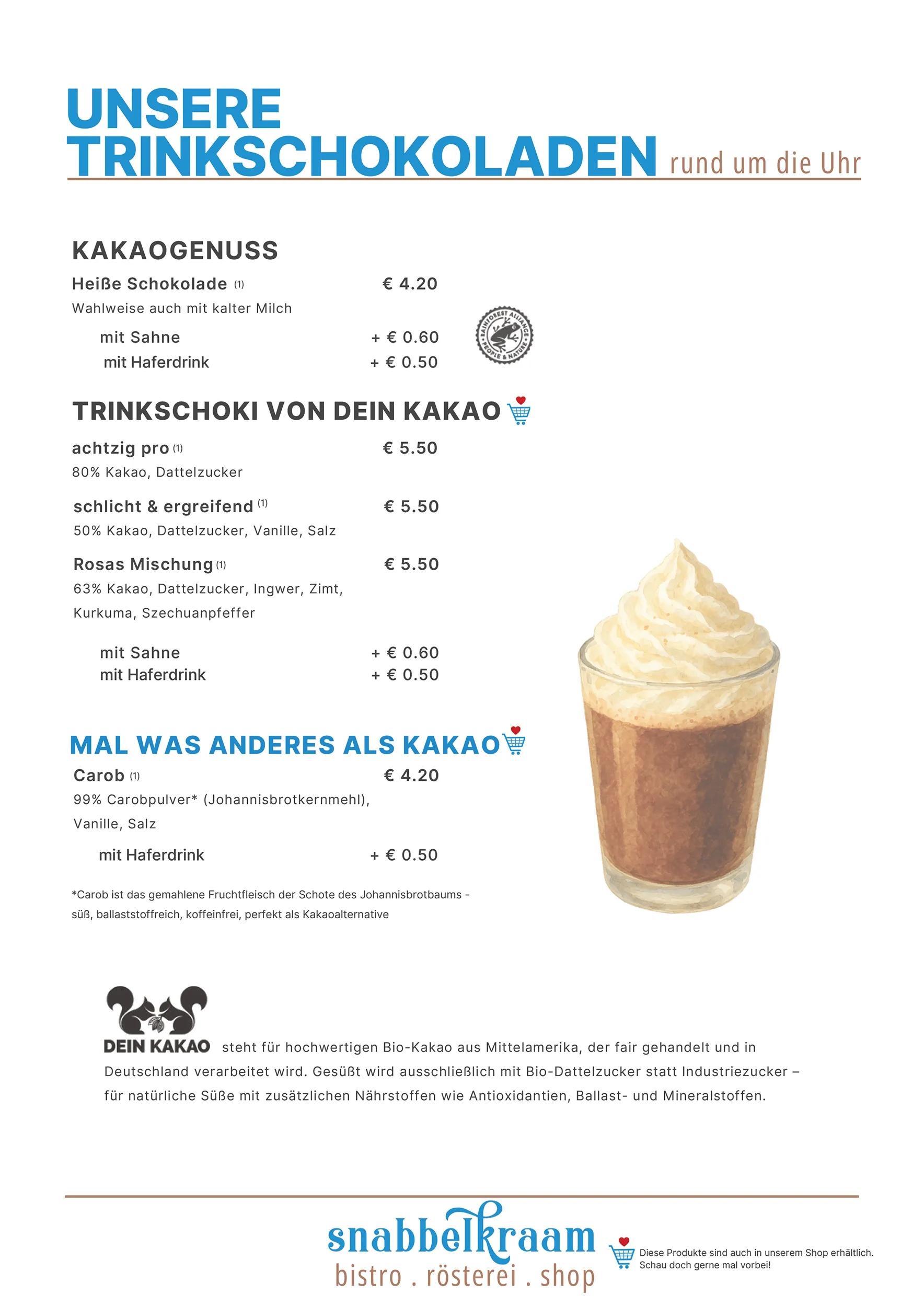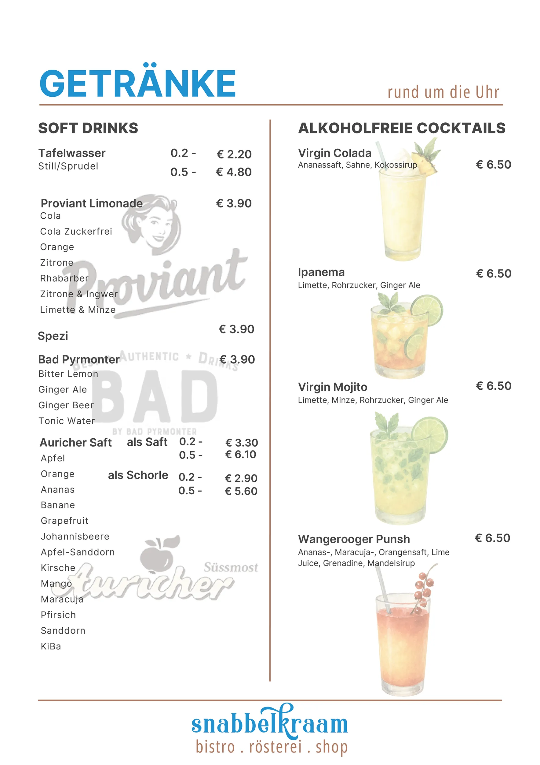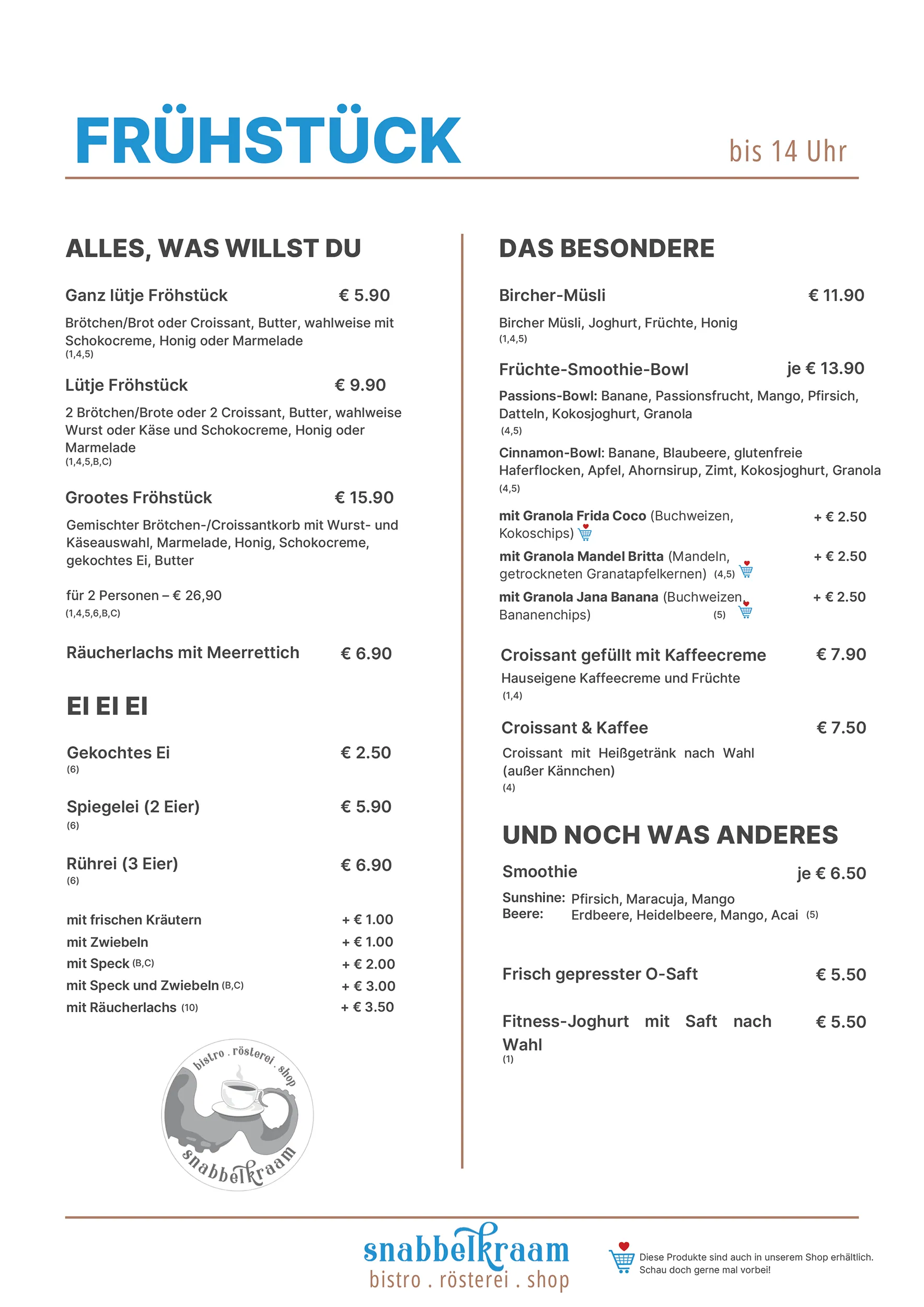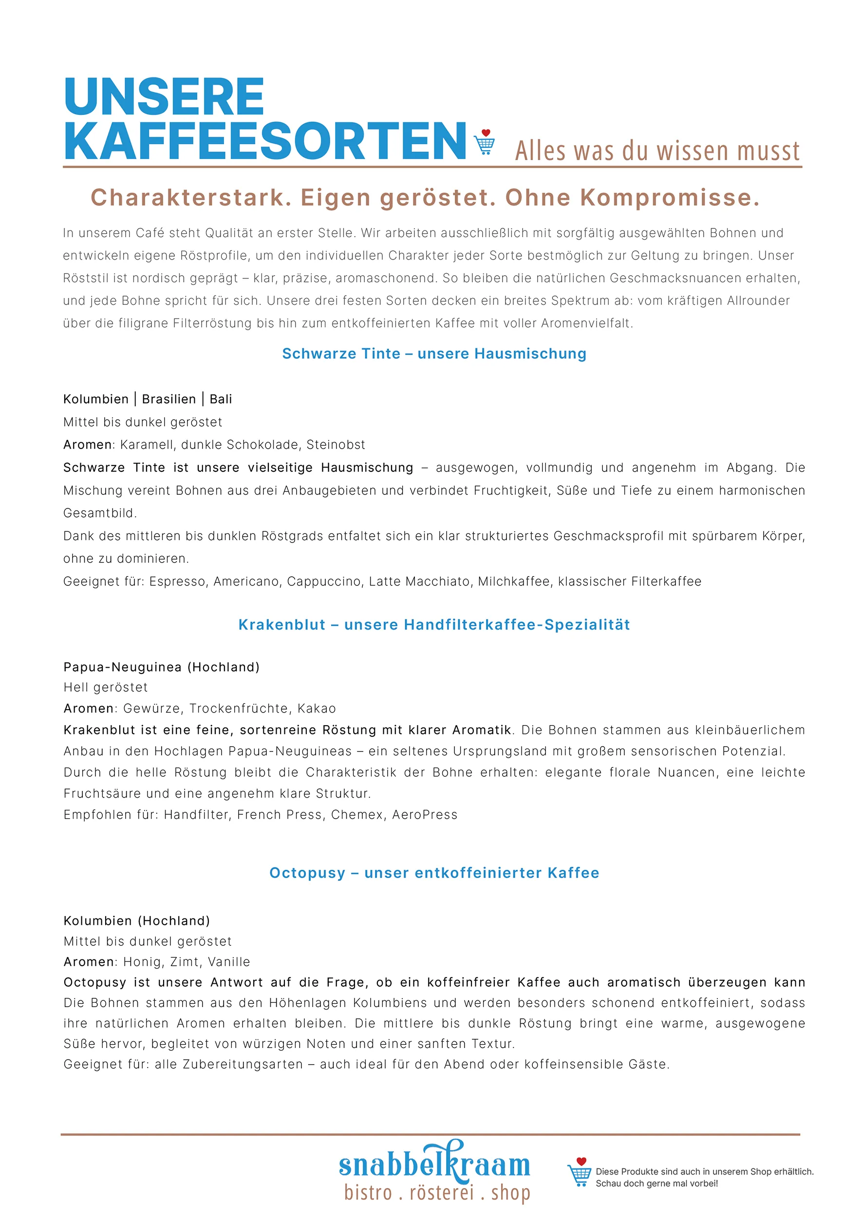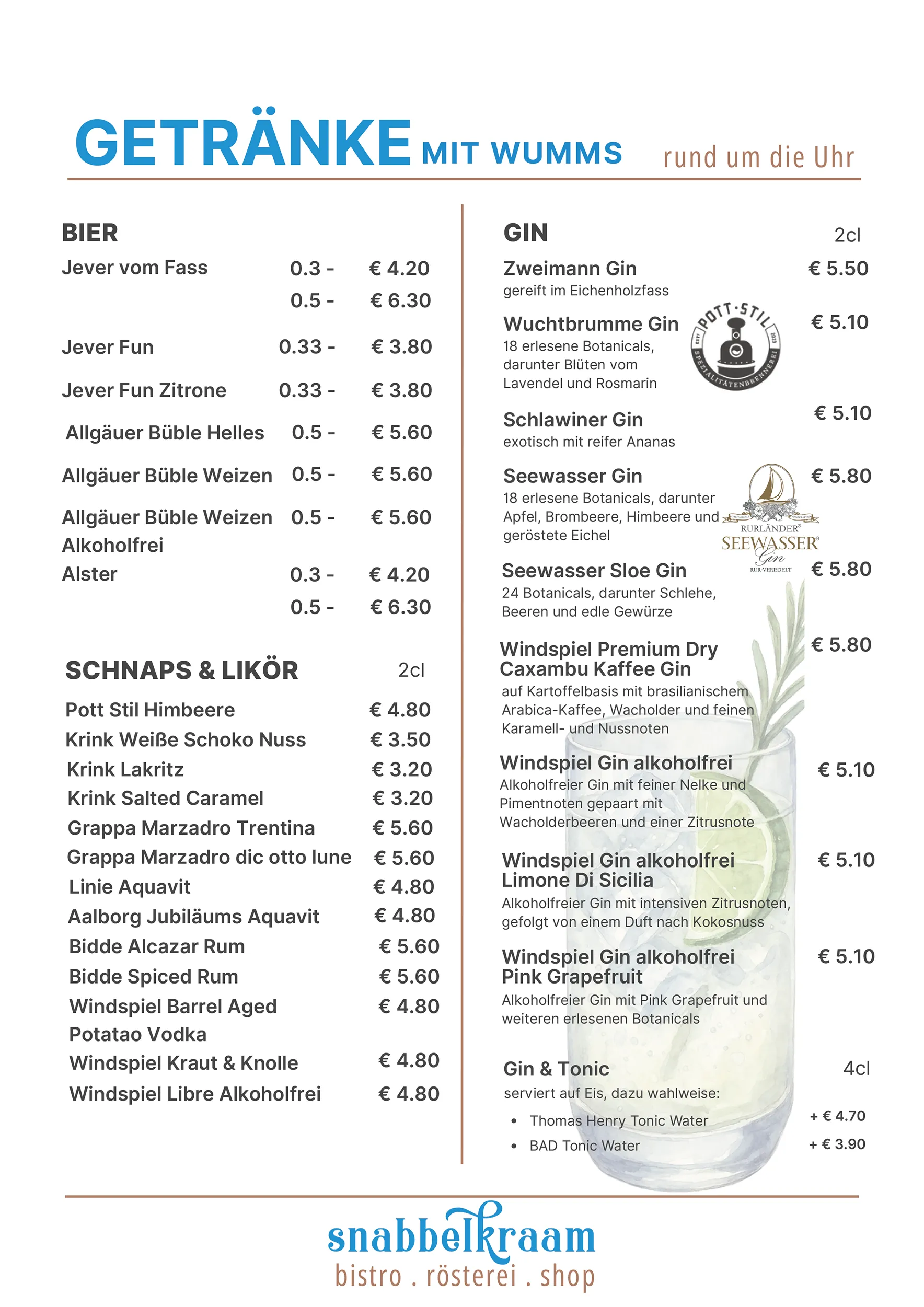 Von früh bis spät. Mitten auf Wangerooge. Mit Charme, Charakter und ganz viel Genuss. Ob Frühstück „lüt oder groot“, Kuchen am Nachmittag oder ein feines Abendessen – bei uns kommt nur Gutes auf den Tisch: frisch, saisonal und mit Liebe gemacht. Unsere Küche überrascht mit raffinierten Bowls, aromatischen Suppen und kreativen Stullen – immer farbenfroh, ansprechend angerichtet und voller Geschmack. Abends servieren wir feine Gerichte, die das Auge ebenso erfreuen wie den Gaumen. Für alle, die lieber bunt als beliebig essen. Dazu gibt’s Kaffee aus unserer hauseigenen Rösterei – aromatisch, handgemacht, zum Hierbleiben oder Mitnehmen und Tees, die überraschen. Zum Tagesausklang wird’s gemütlich: mit feinen Cocktails, ausgewählten Weinen und dieser Snabbelkraam-Gemütlichkeit, die man erleben muss.